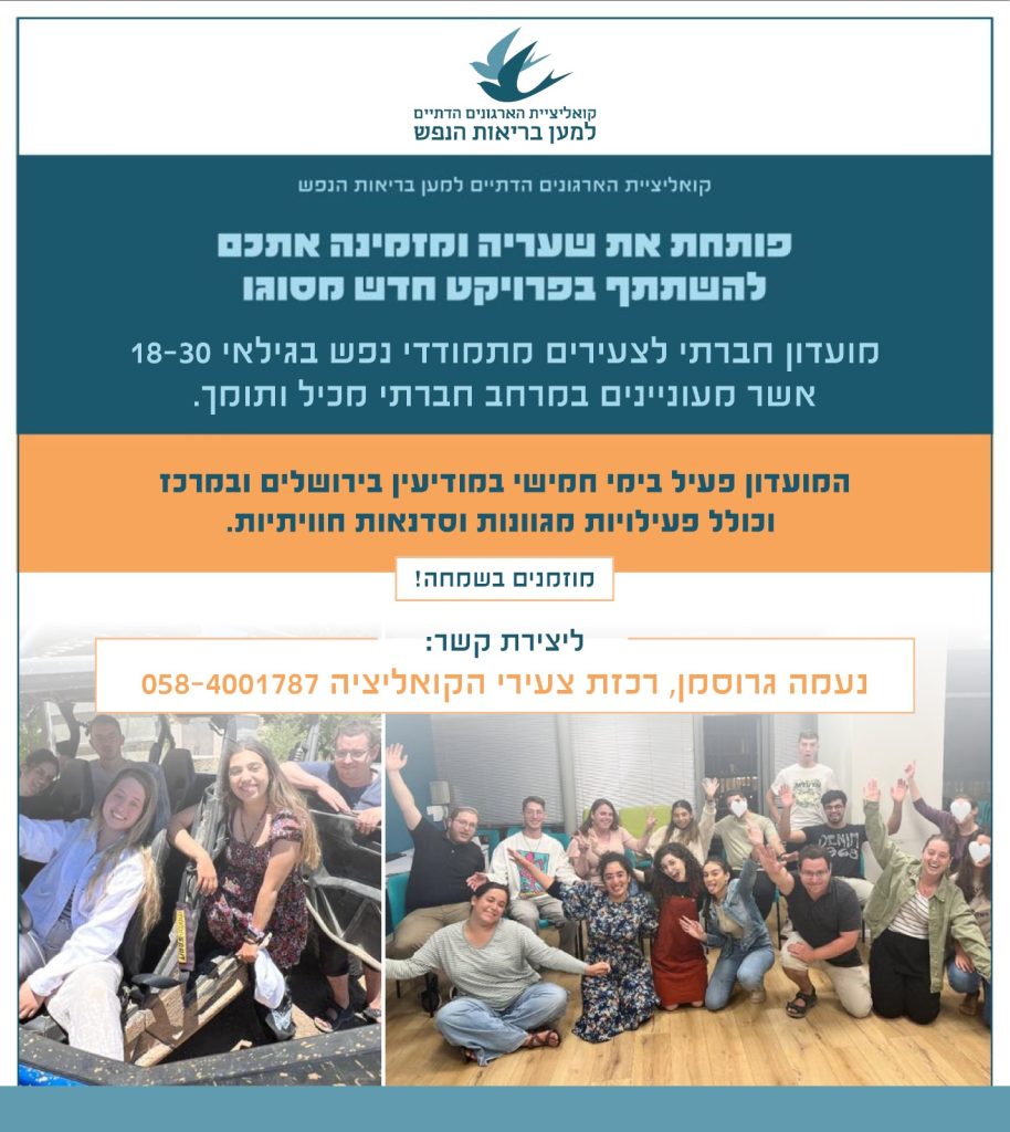 הומיה פותחת את שעריה ומזמינה אתכם להשתתף בפרויקט חדש מסוגו: מועדון חברתי לצעירים מתמודדי נפש בגילאי 30-18 אשר מעוניינים במרחב חברתי מכיל ותומך. המועדון פעיל בימי חמישי במודיעין, בירושלים ובמרכז וכולל פעילויות מגוונות וסדנאות חוויתיות.